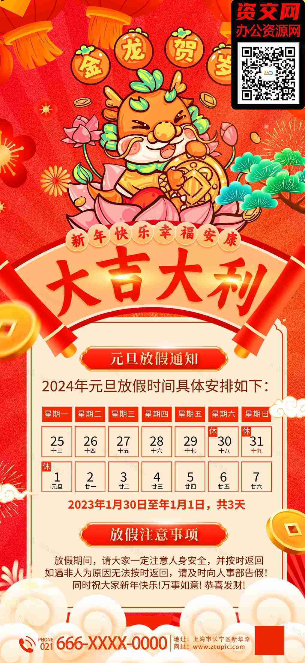 2024金龙贺岁龙年春节元旦放假通知海报模板免费下载
